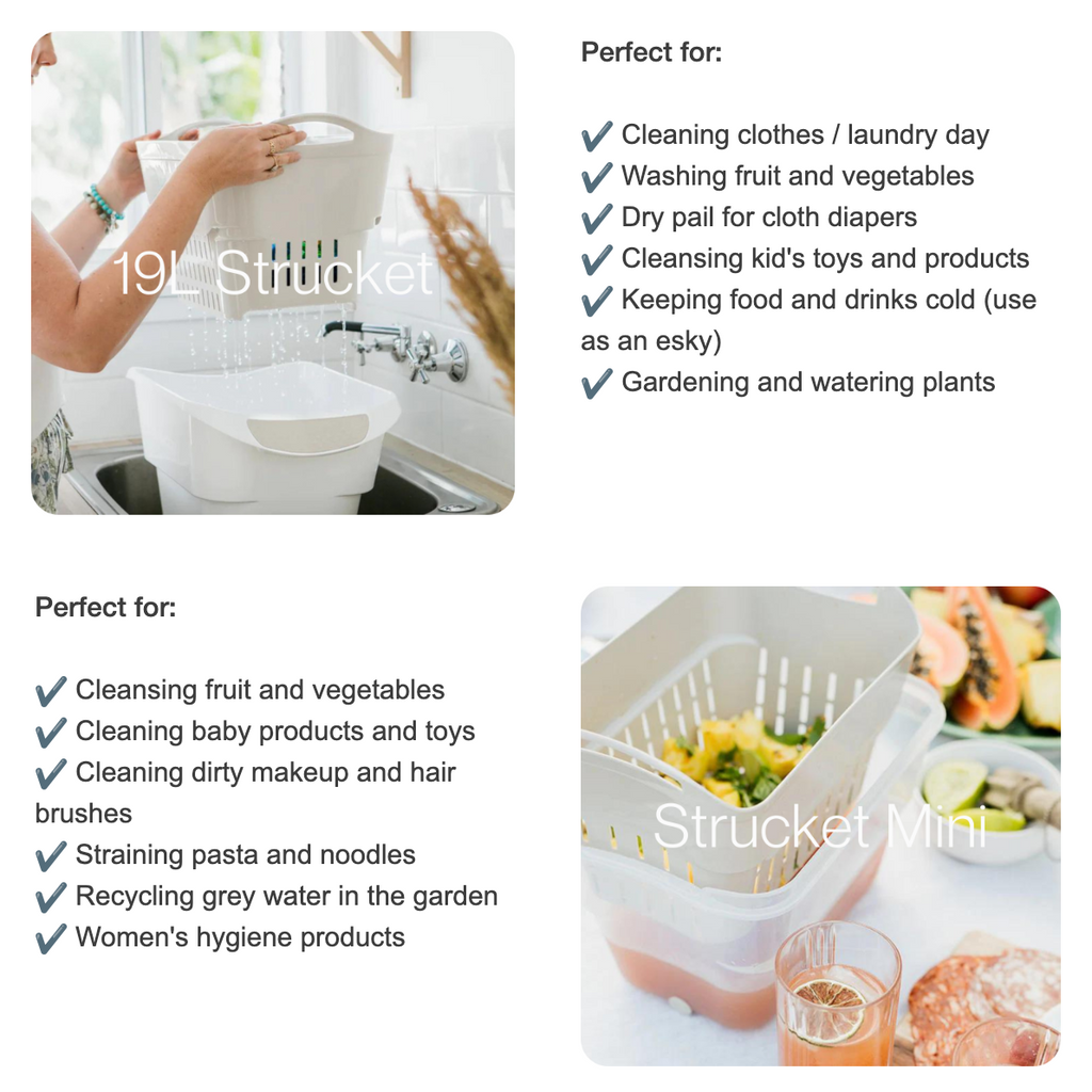 The Strucket Mini features the same world-first interlocking strainer and plug system, but is sized to suit your smaller laundry, kitchen or household needs.