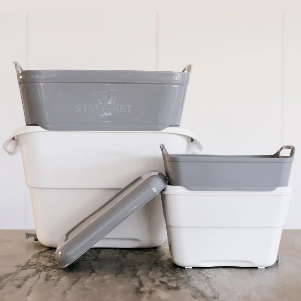 Strain - Easily lift the strainer from the bucket, click into place and separate the soaked items, leaving the dirty water behind. Our famous interlocking connection allows your strainer to connect and elevate above the base of your Strucket.