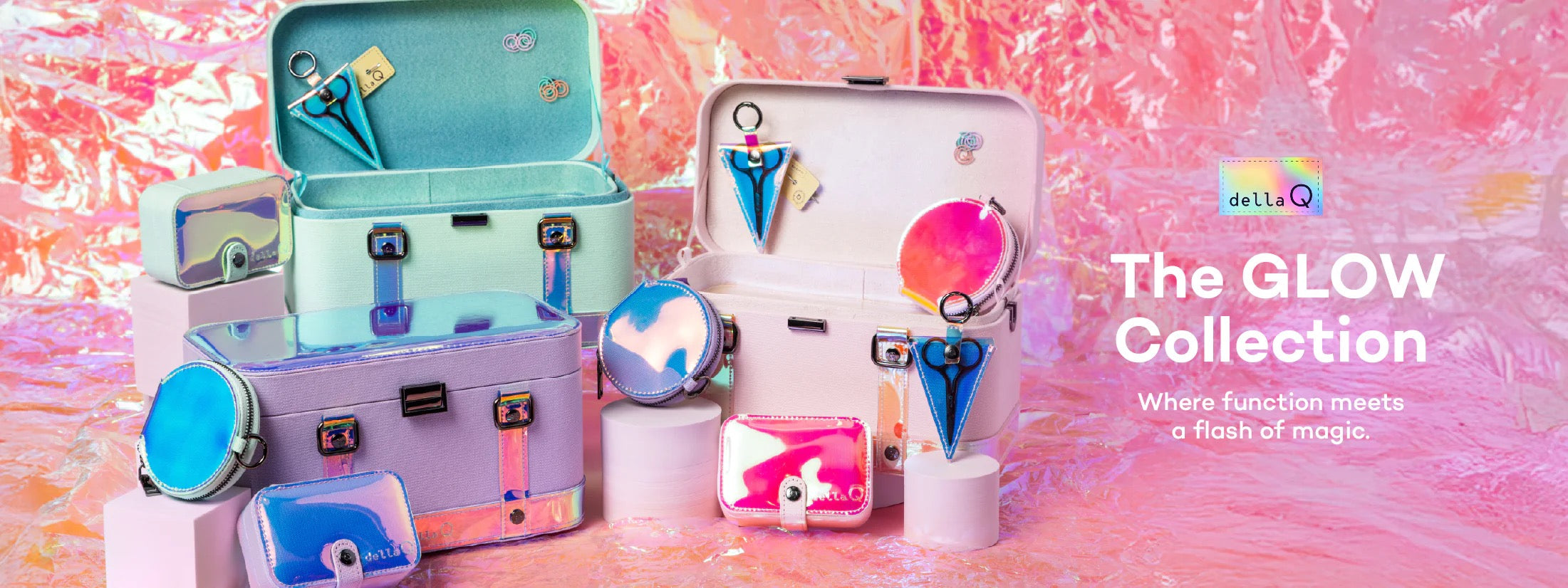 Made for our wanderlust makers, the reimagined Train Case from the della Q GLOW Collection adds a modern edge with gunmetal hardware, unwaxed canvas, and shimmering iridescent vinyl accents.