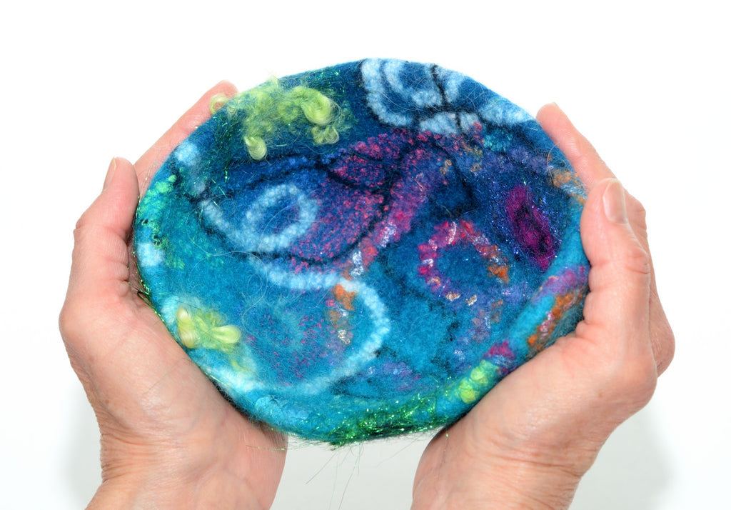 Learn a clever new technique for wet felting with a resist and create a sturdy bowl to hold your keys, chocolates or simply to brighten up your creative space.